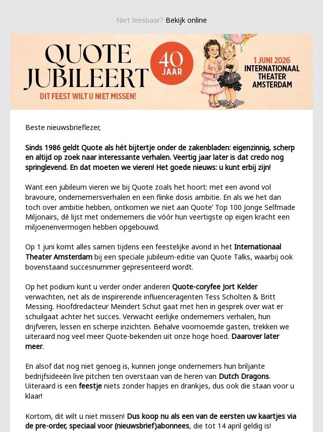 Quote jubileert op 1 juni 2025. Dit fees...